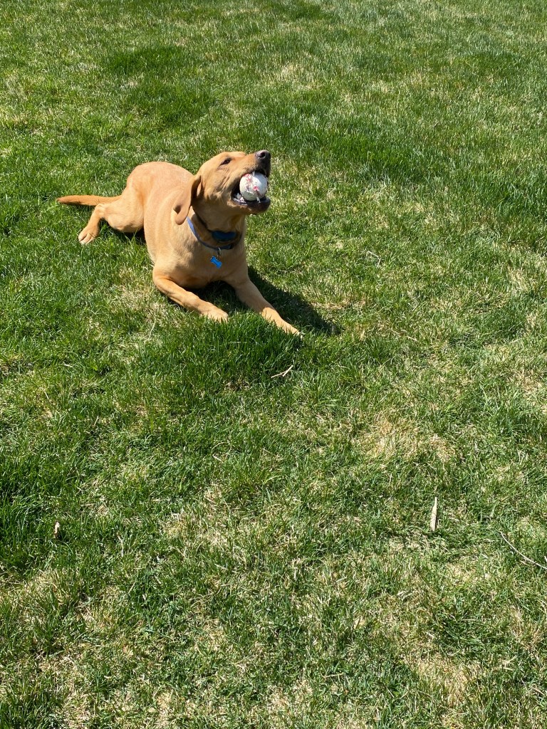 This is my dog Zephyr. He likes to go for long walks and play endless rounds of catch. I try to make him happy with a long walk in the morning and several rounds of catch throughout the day. The problem is he plays too hard and ends up limping by the end of the day. I have tried explaining to him that we need to cut back on play time, but he is not interested in listening to logic. With the warmer weather and being able to be outside more, he things this should bring on more games of catch, not less. Now my neighbors get to listen to him give one bark on repeat as he tries to convince me to just throw it one more time. It may be a long summer.
