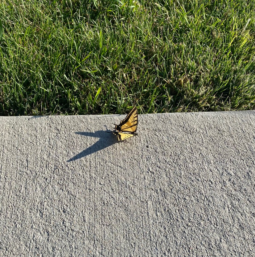 7/9 - After the Rain Just a butterstay Waiting for its wings to dry Then a butterfly I was worried the butterfly was injured because he didn't fly away as we walked by. I went home and researched they can't fly when their wings are wet and have to sit and patiently wait for them to dry.