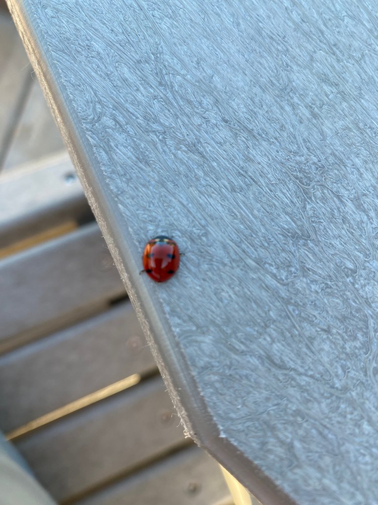 7/14 - Lucky Favored this morning Small beetle of red and black Garden pests doomed I was pleasantly surprised when this ladybug joined me for breakfast. Did you know they are actually beetles and not bugs?
