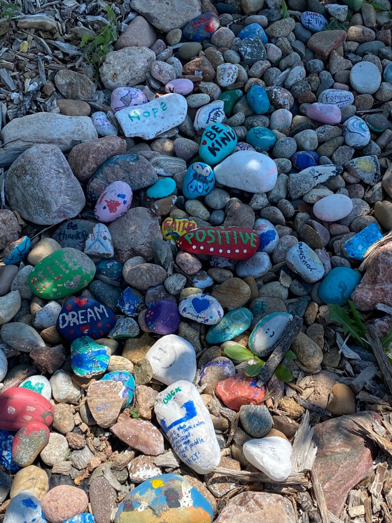 My haiku journey continued this week with an escape from the heat. I was able to head up to the mountains with a friend and my dog. A change of scenery is a great way to reawaken the sense of wonder. Before my trip, I discovered a small garden in the center of town that had painted rocks displayed. They were painted by a children’s group to bring kindness to all who saw them. I wonder if my musings bring joy.